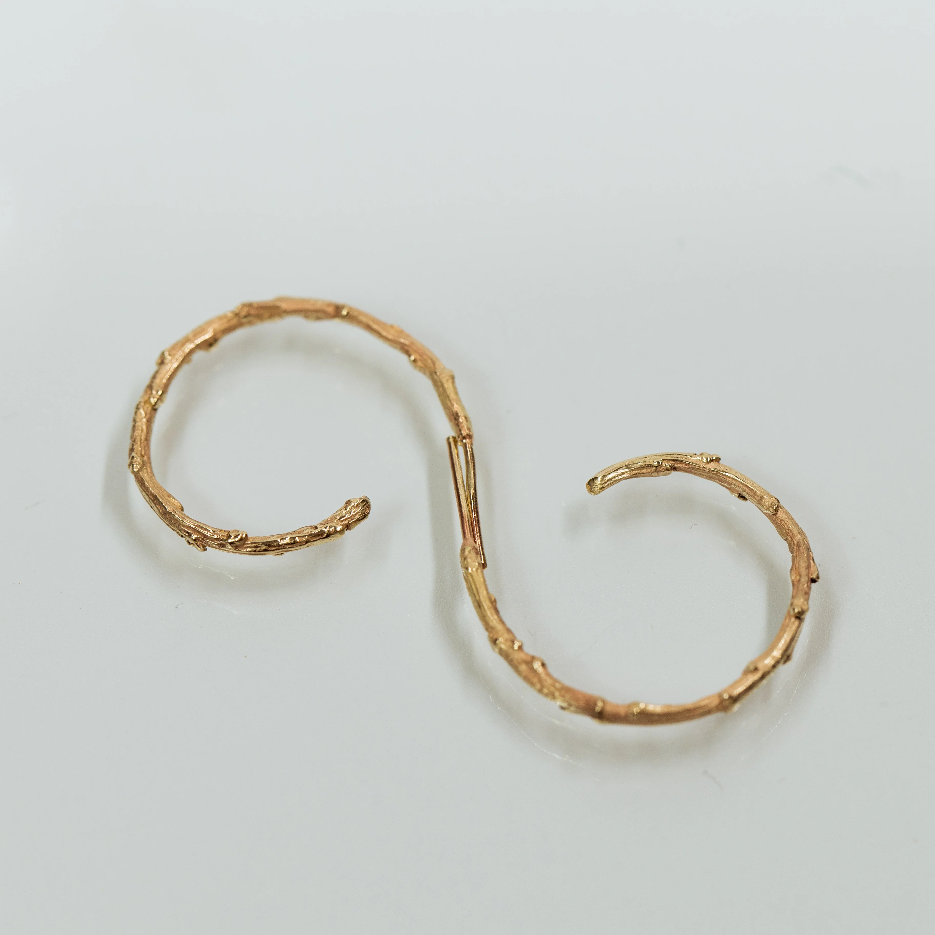A 14k yellow gold round thin branch earrings. Open round hoops inspired by branches. It is a fun design to wear as a pair or as a single piece.