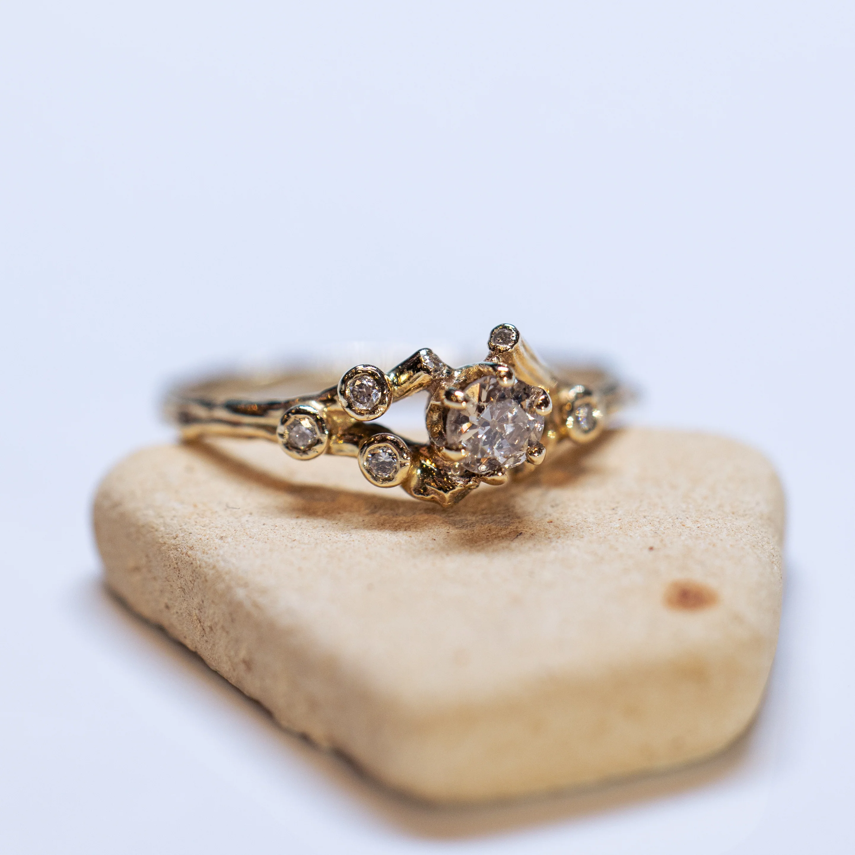 At the center of this captivating ring sits a dazzling 0.25ct champagne diamond, capturing attention with its brilliance and radiance. Adding a touch of whimsy and allure, 4 small diamonds are asymmetrically scattered on the branches, creating a truly distinctive look. This arrangement adds a touch of unexpected charm, ensuring that this ring stands out from others.