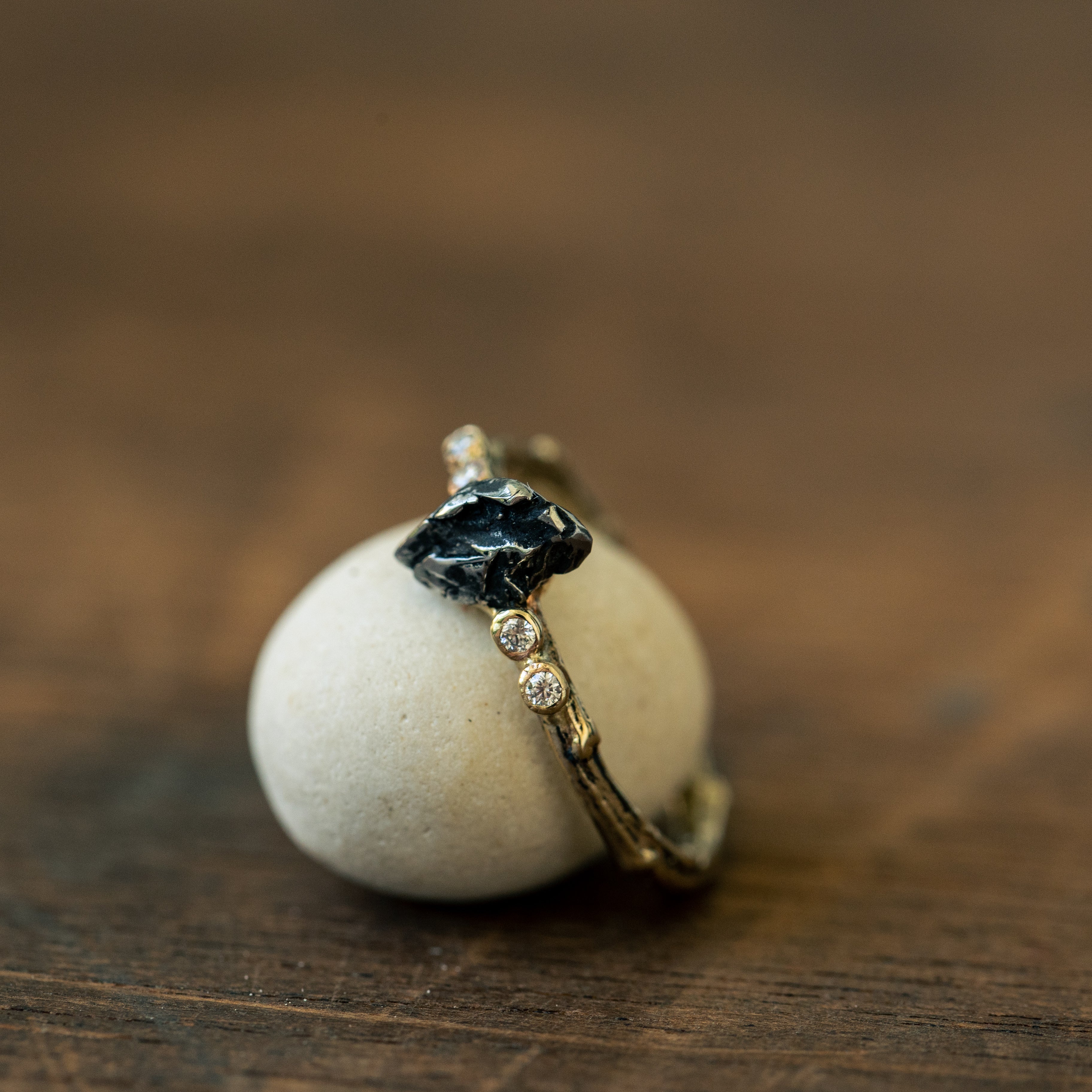 14k gold branch ring with a beautiful piece of Campo del Cielo meteorite accompanied by 2 small white diamonds on both sides.