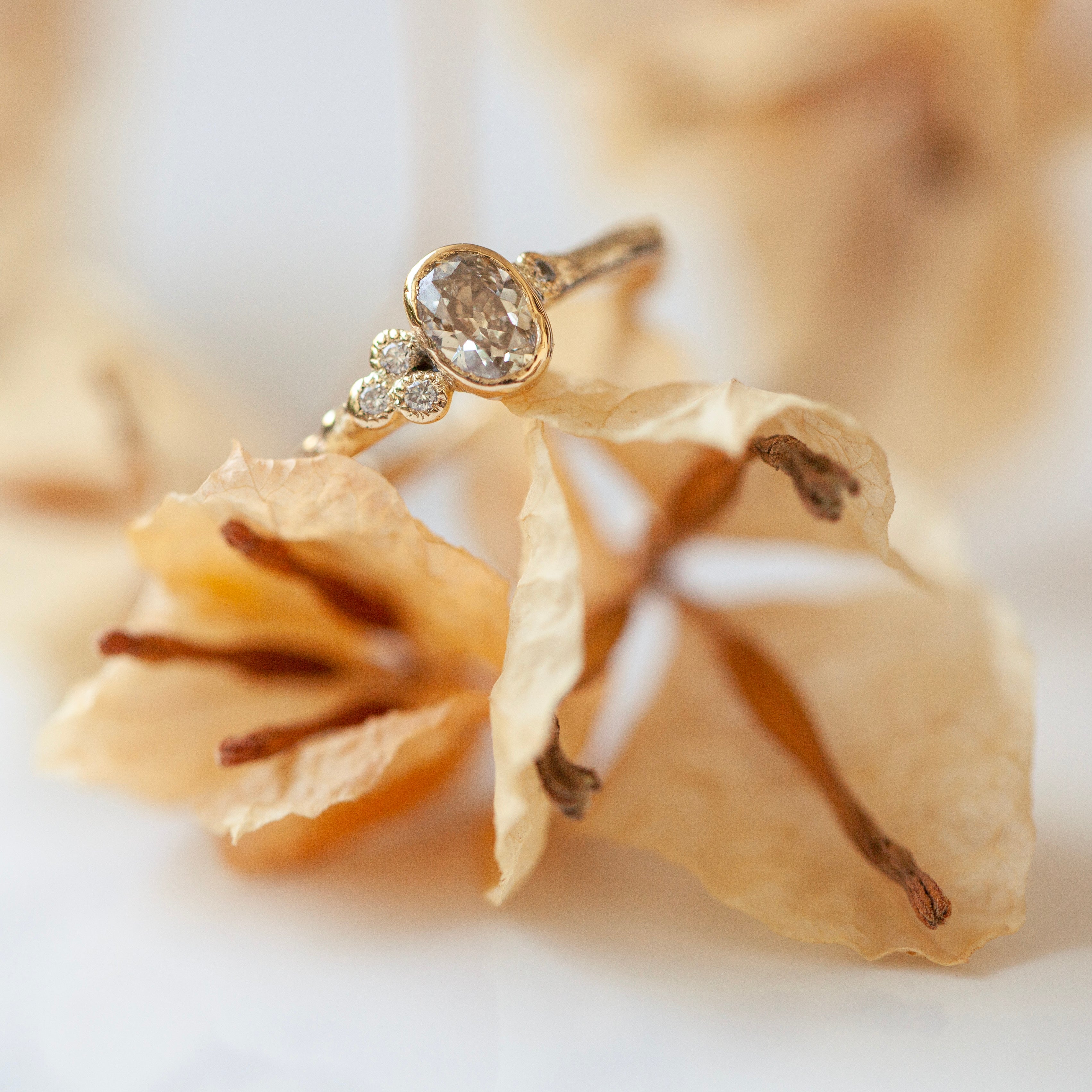 A branch champagne diamond cluster ring of 14K yellow gold, set with a 0.45ct oval champagne diamond in the center and 4 smaller brilliant cut diamonds. Beautiful and unconventional engagement ring set with a mixture of sizes and shapes of diamonds, giving it an overall look of classic wear, but not a very common engagement ring.