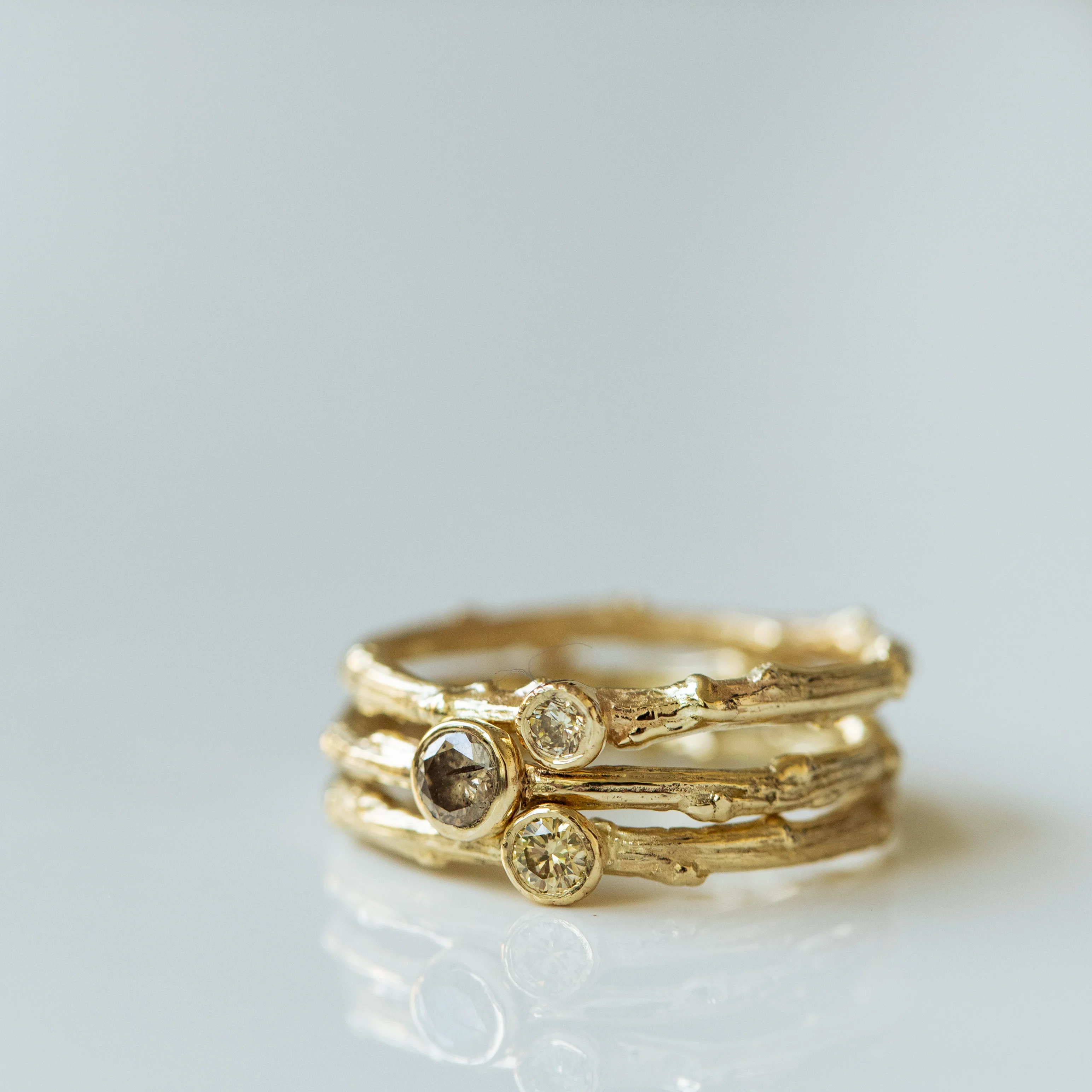 3 separate branch rings 14k yellow gold set with champagne diamonds.