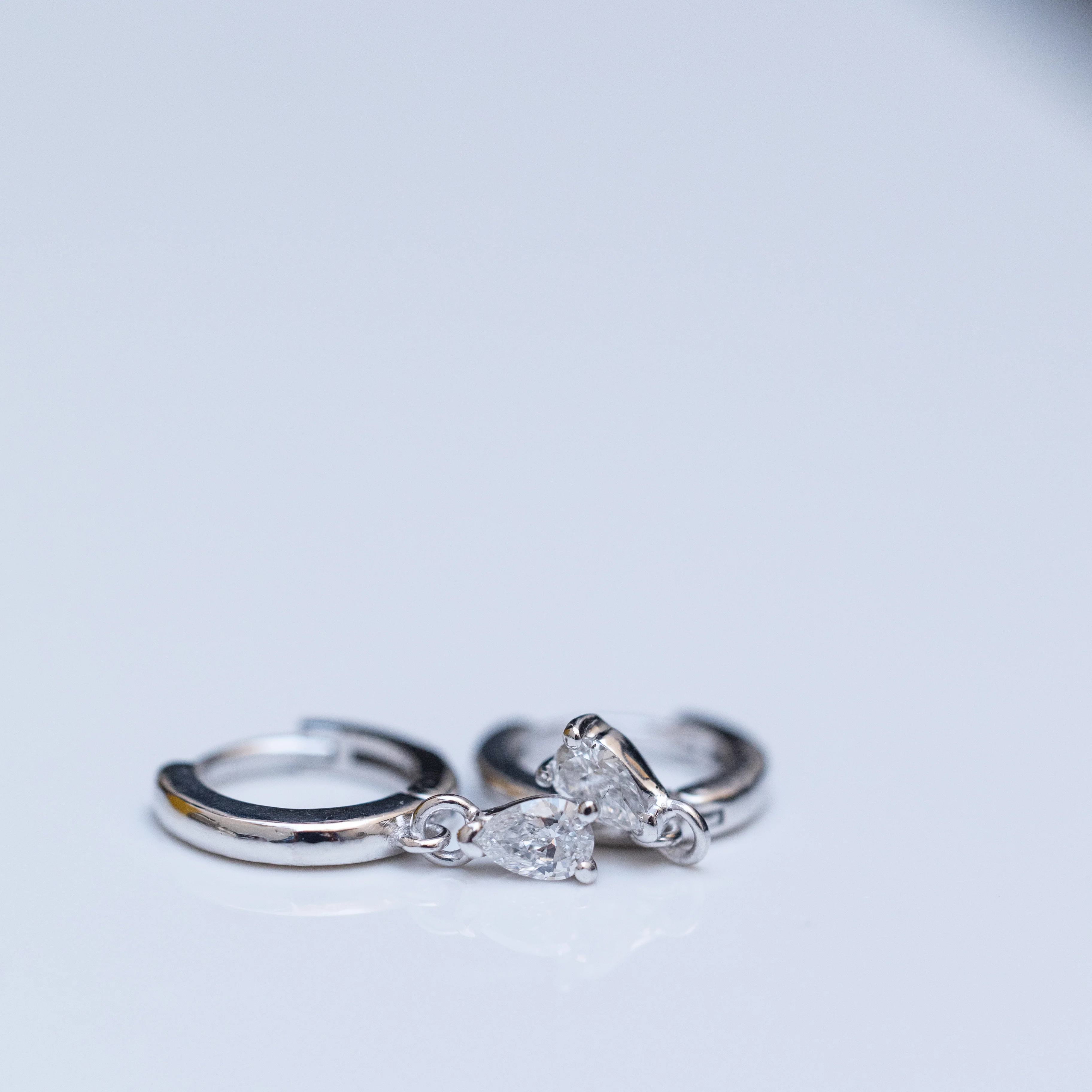 These are classy and timeless, small and clean hoop earrings, with a dangling Lab diamond of 0.15ct set with three prongs (on each earring).