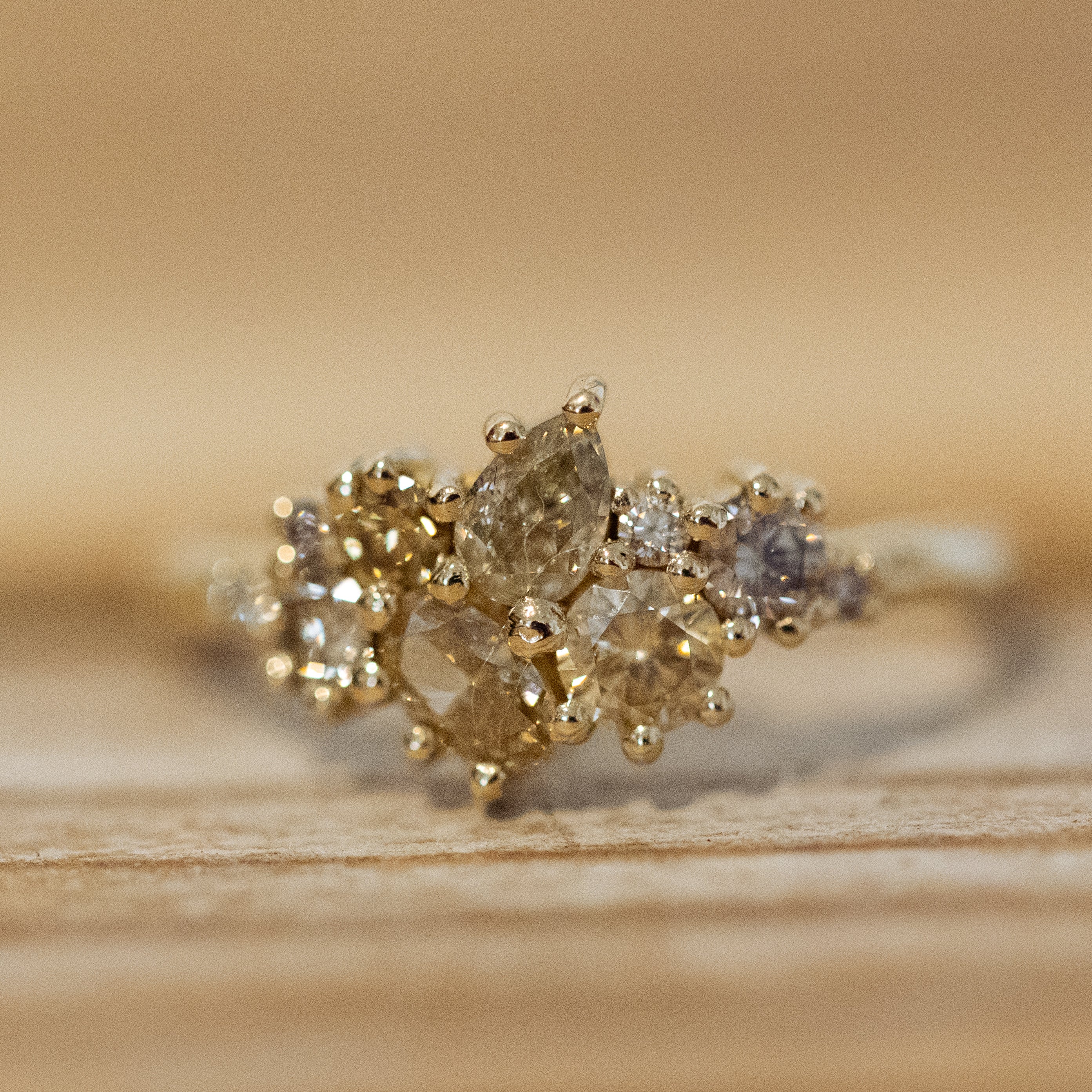 A 9-diamond set ring made of 14K yellow gold, beautifully set with about 0.70ct different colors of champagne brilliant cut diamonds. You can choose your color to give this design its exact touch. Contact us with any additional questions.