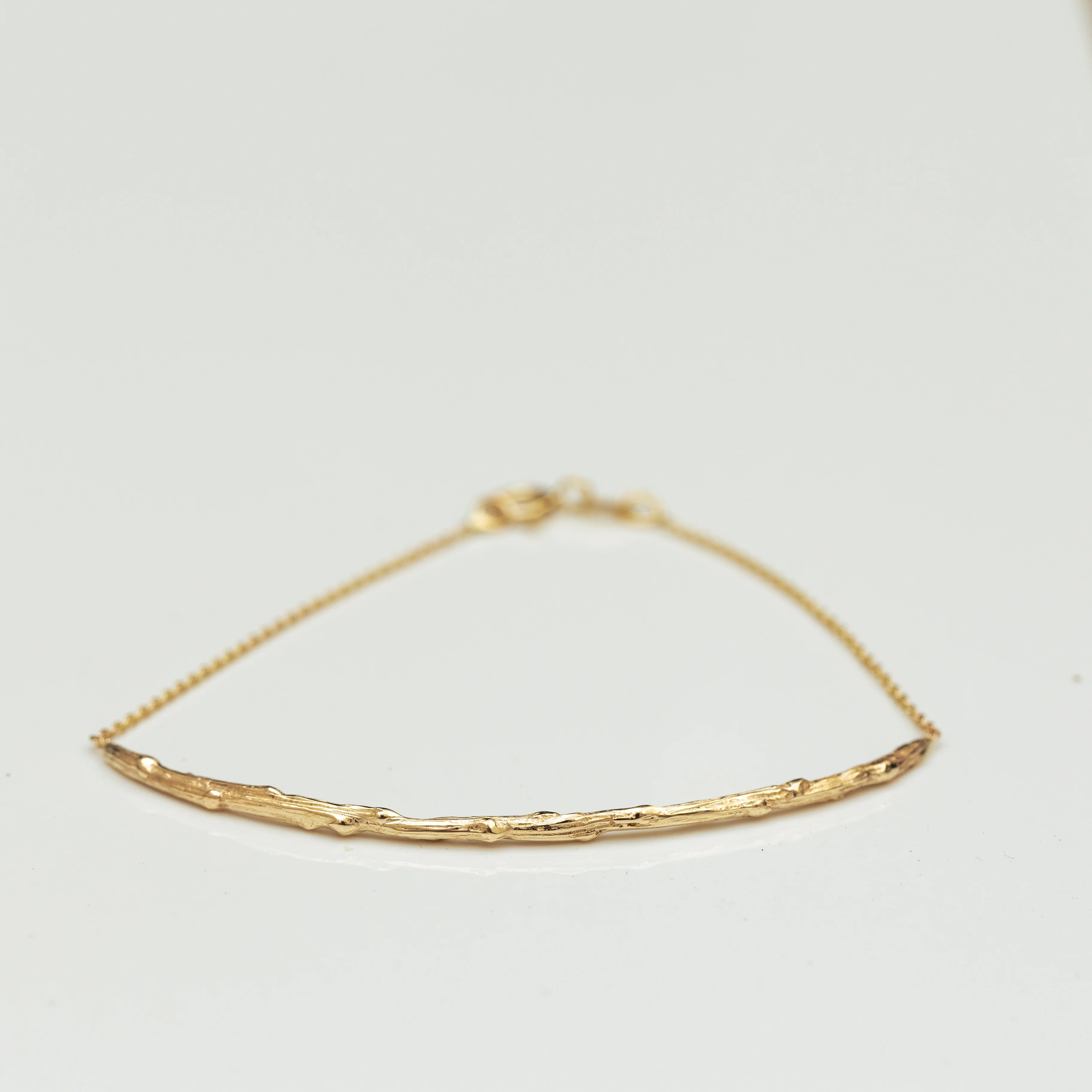 A Gentle branch bracelet with a double 14k yellow gold chain. The color of the gold can be changed by choice.