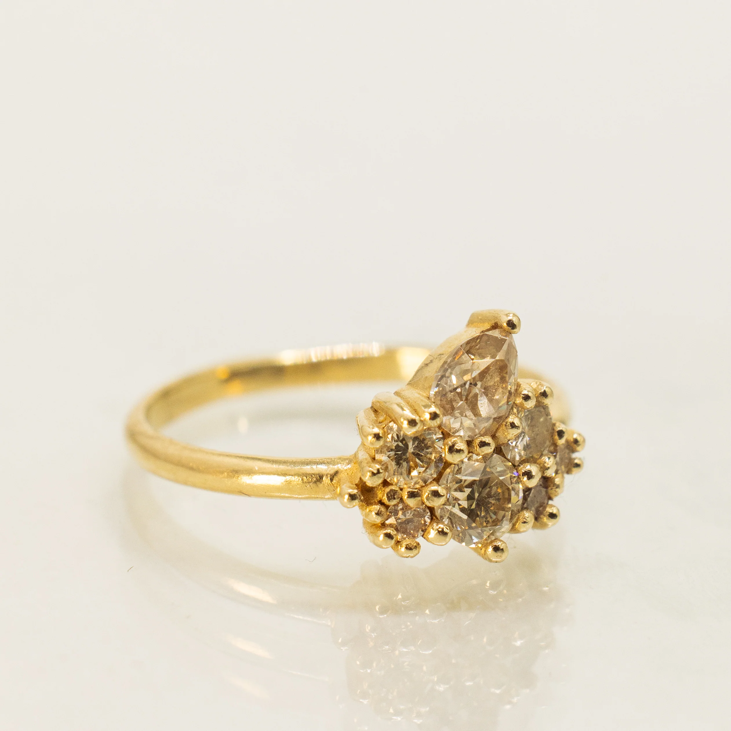 A champagne diamond cluster ring made of 14K yellow gold is a beautiful and unconventional engagement ring set with a mixture of diamond sizes and shapes. The total of 1.4ct gives an overall look of classic wear in a unique engagement ring.
