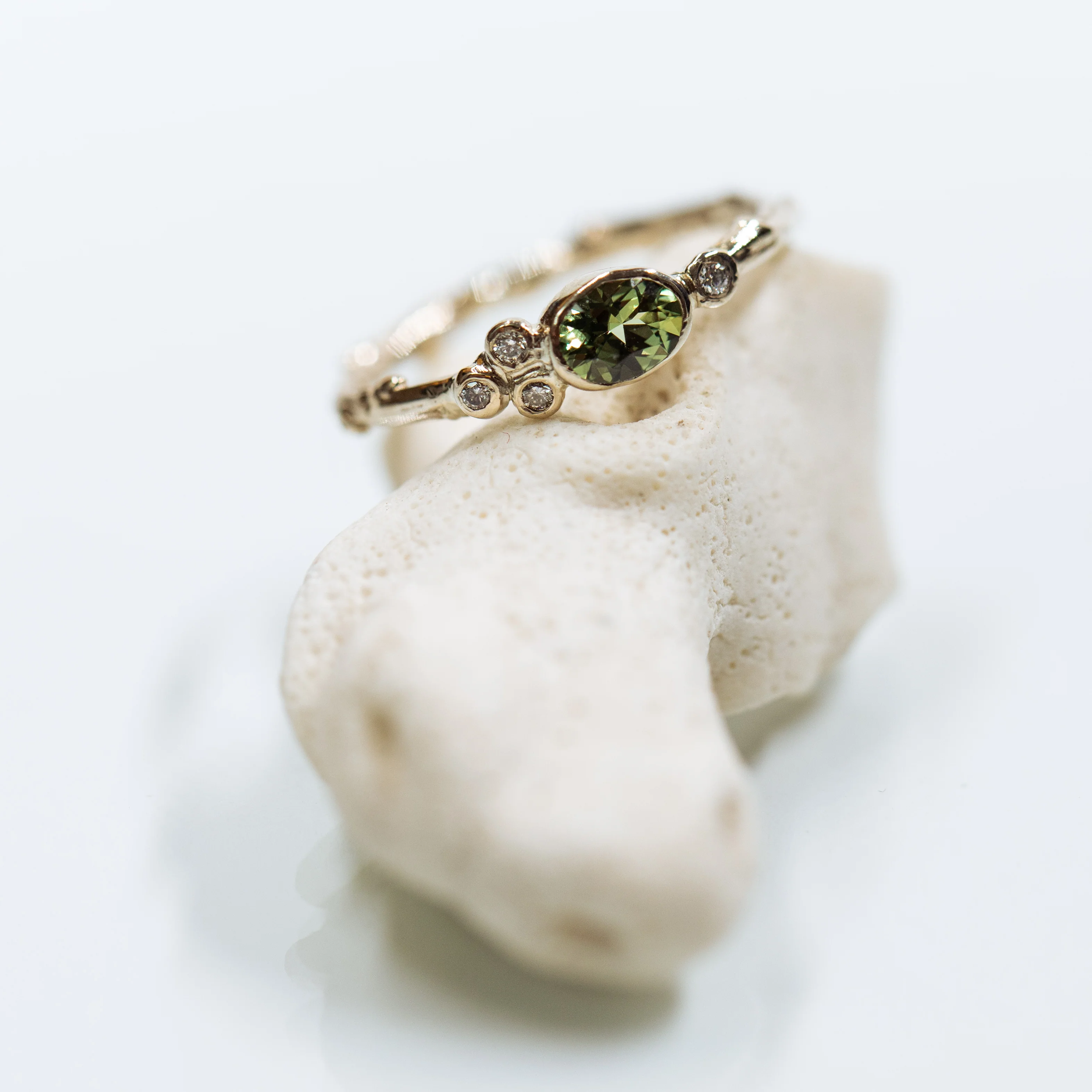 A branch ring set with a unique green sapphire in the center and 4 small diamonds asymmetrically on the sides. It is a beautiful and unconventional engagement ring. The branch and the stone's color give this ring a natural look, classic wear, but not a very common engagement ring.