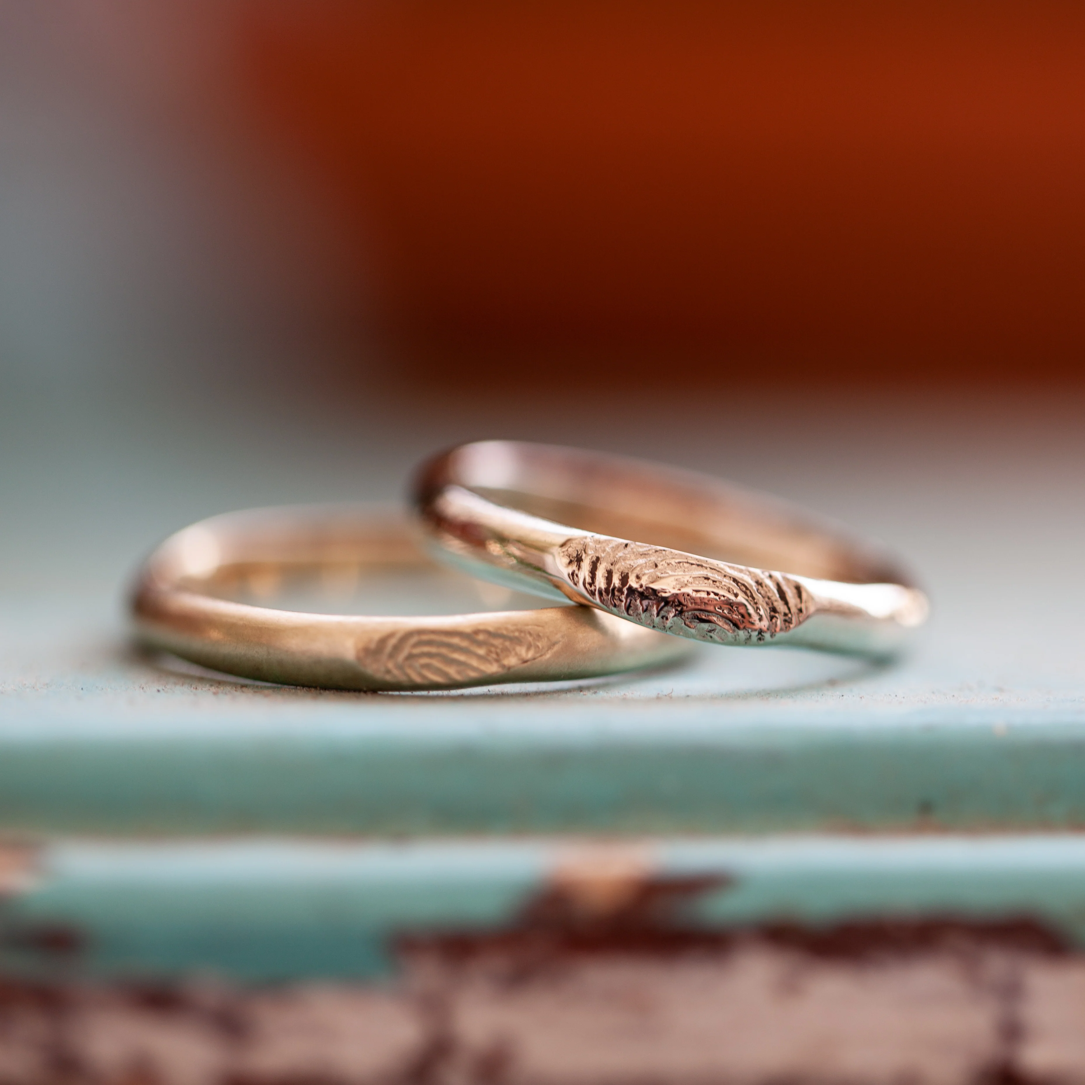 14k thin raw gold ring with personal fingerprints on each ring; he gets her fingerprint and vice versa.