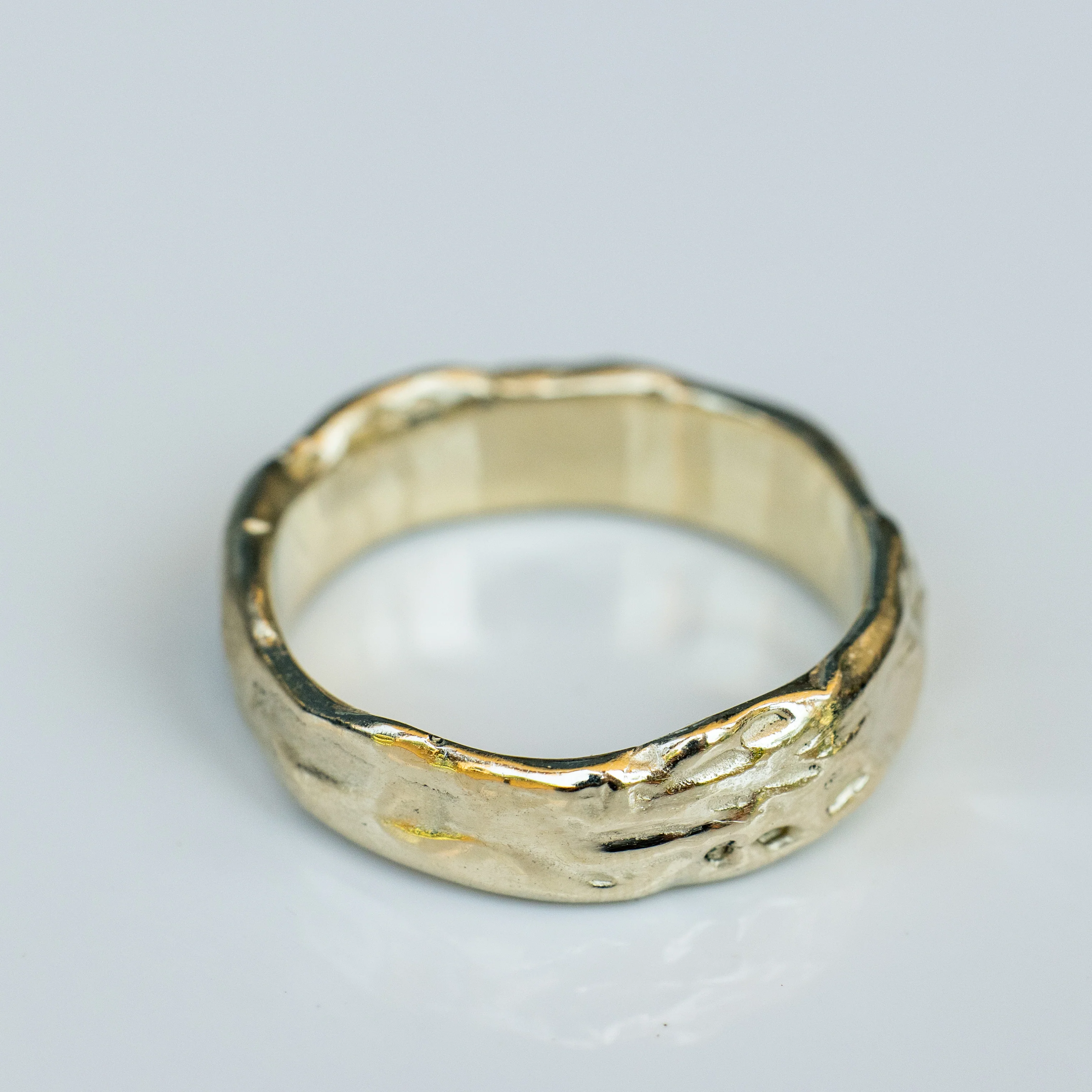 Its wide 5–6 mm band with gently uneven edges creates a bold yet refined presence, catching and reflecting light in ever-changing patterns. The organic surface gives the piece a harmonious balance of strength and softness, making it comfortable to wear.