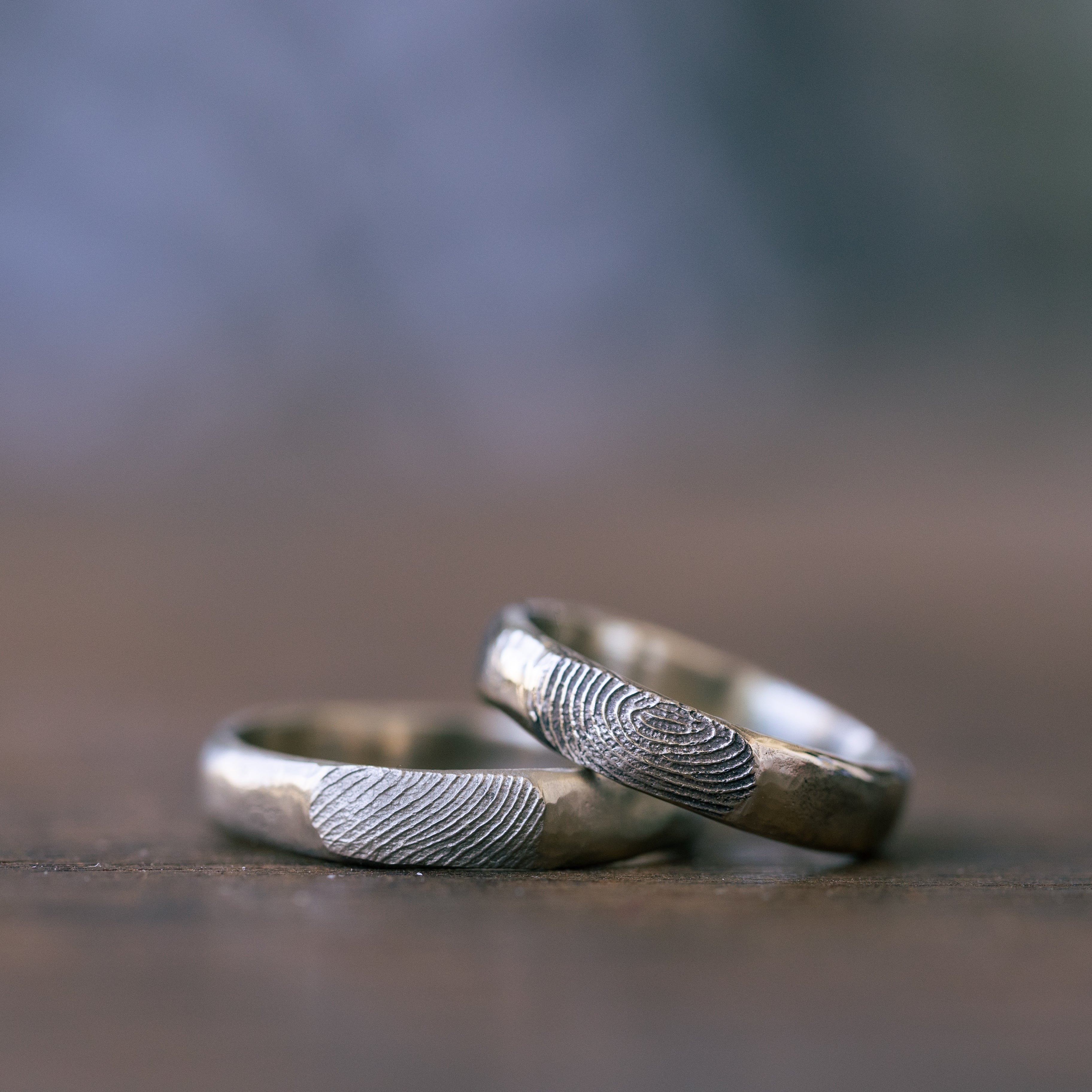14k classic gold shiny half-round rings with personal fingerprints on each ring. He gets her fingerprint and vice versa.