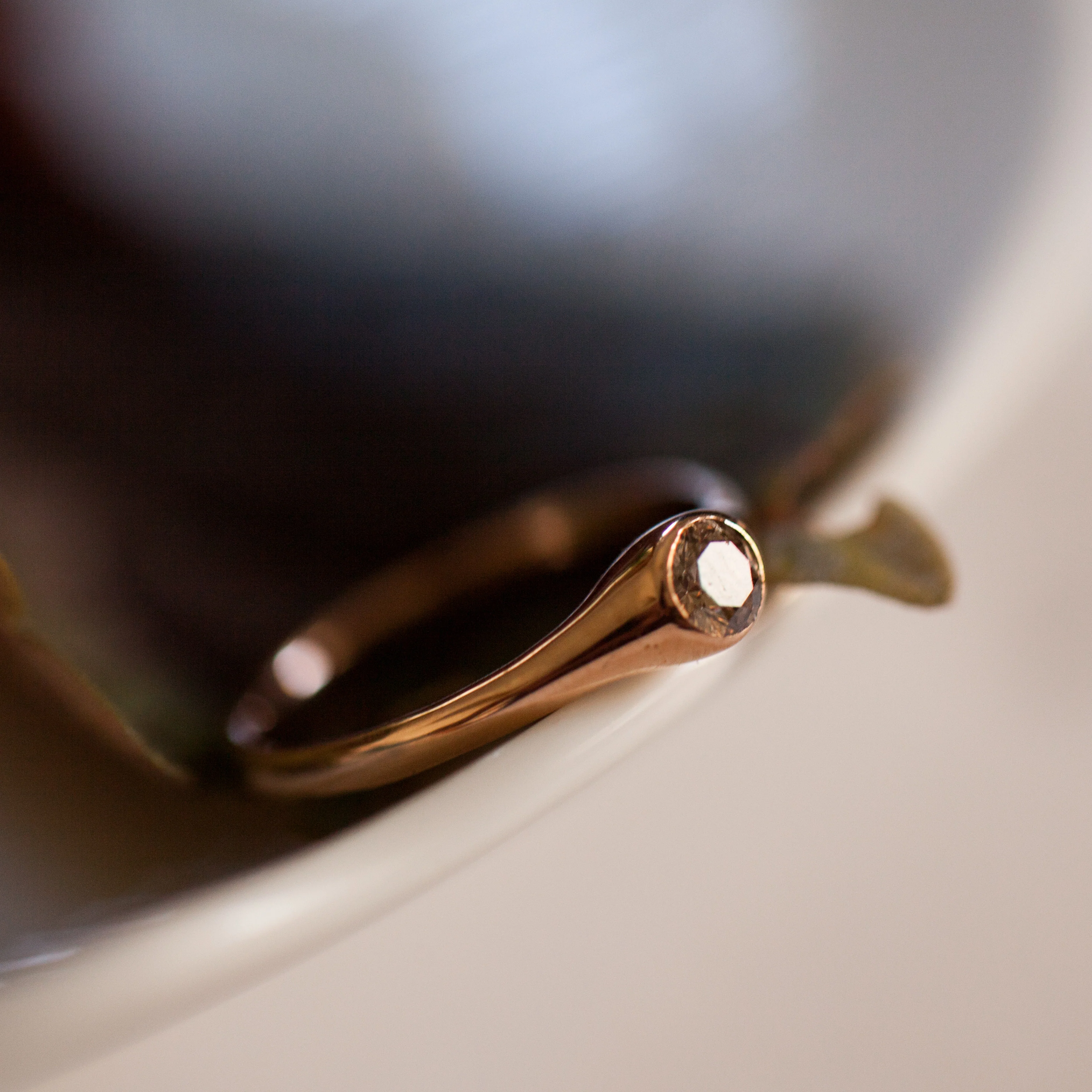 A 14K rose gold ring set with a brown diamond sitting low, almost merging with the gold to give it a more fluid feel, has a unique, thick, yet quiet and gentle. This ring feels right on the hand, with not too much bling and an even smoother set, which helps quieten it even more.