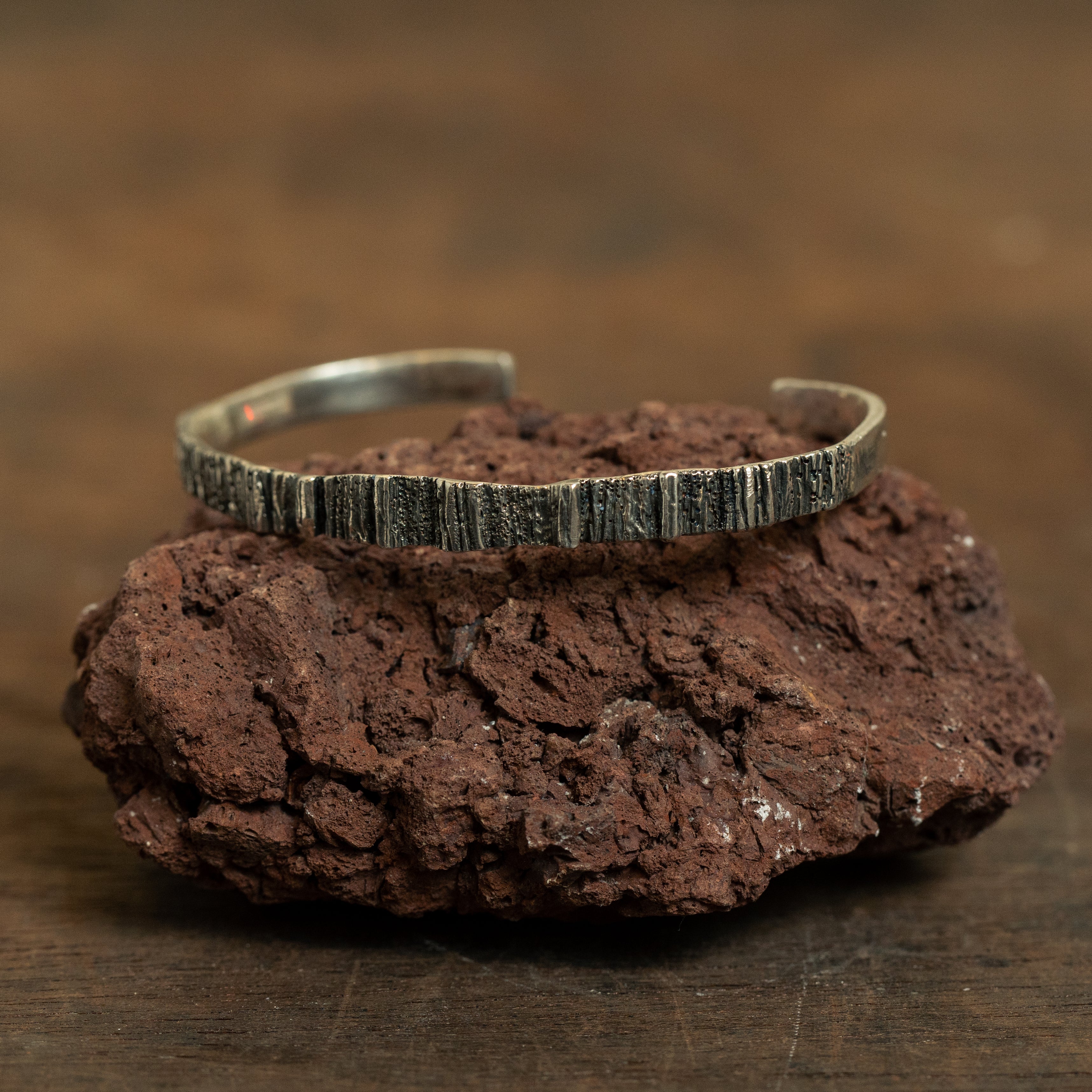 This is a sterling silver solid bracelet with an organic rough texture. It is natural in appearance, with a grooved wood pattern. The silver is oxidized, which emphasizes the beautiful texture.